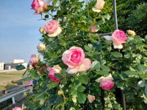 アーチの反対側は「ピエール・ドゥ・ロンサール」で、アイボリーに中央がピンクのカップ咲きです。
