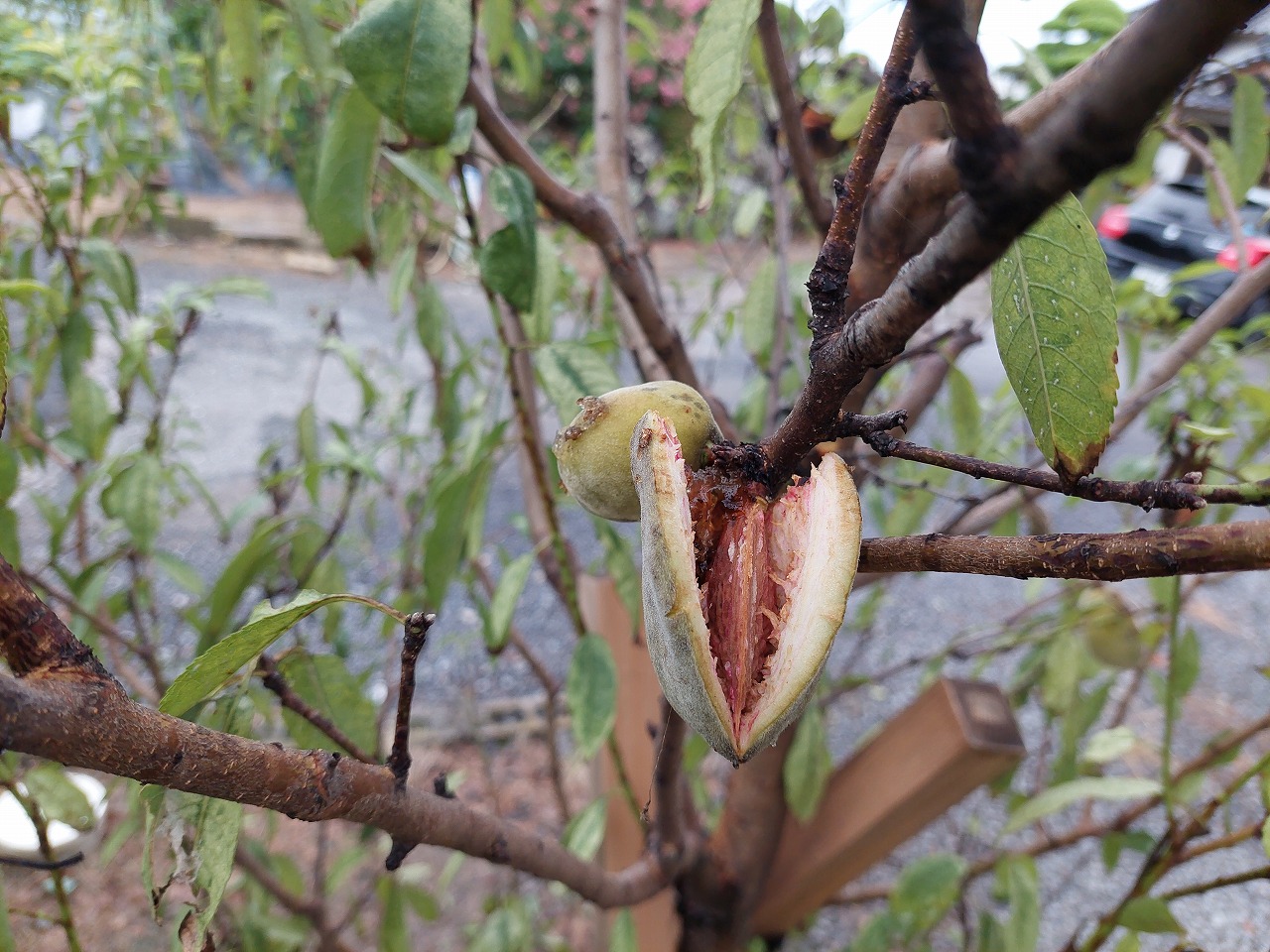 大きくなった果肉が割れて、中の殻が見えてくると収穫時期です。
