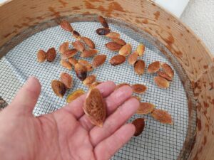さて、庭のアーモンドの実を収穫しました。なんと44個も収穫できました。