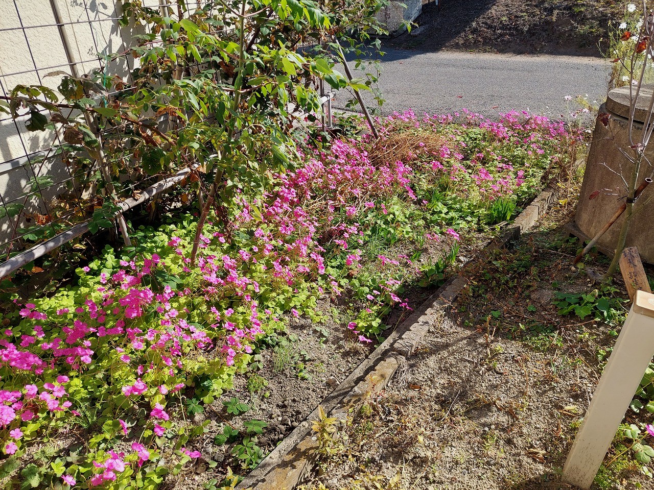 さて、寒風吹きすさぶなか、大きな三つ葉のクローバーにピンクの花が咲いています。