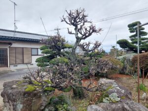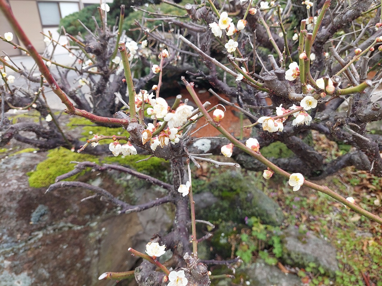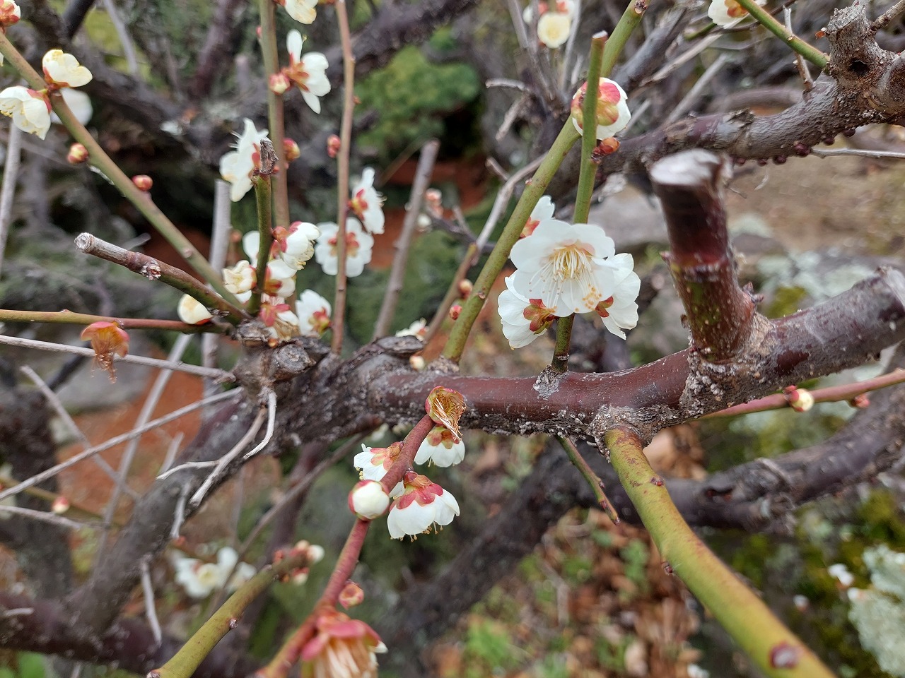 遅咲きの白梅で、他所の梅が散り始めた頃に満開となります。