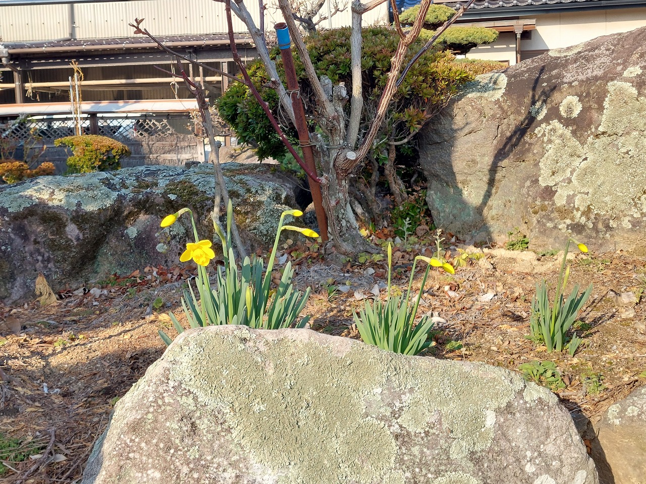 鮮やかな黄色のスイセンは、4年前に農家民泊みどりさん家から球根を分けてもらったものです。