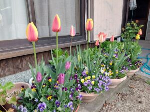 さて、プランターに植えているチューリップが見ごろを迎えました。