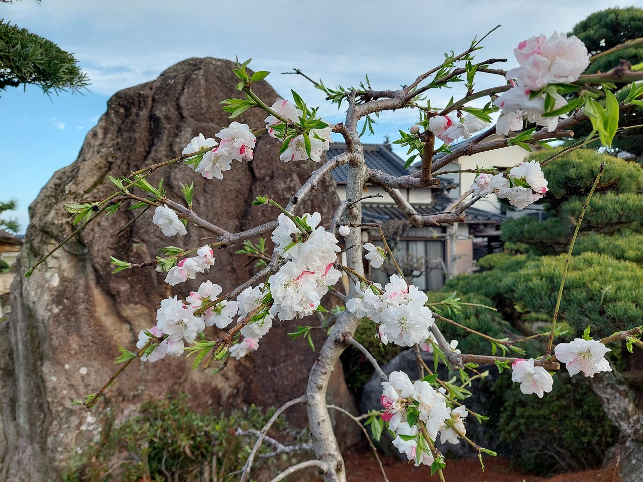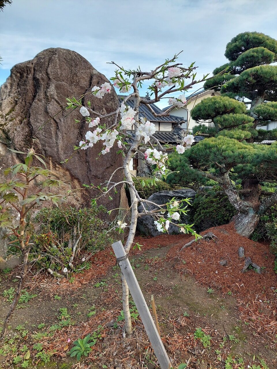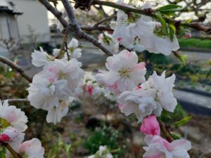 さて、4人目の孫の誕生を記念して植樹した「源平しだれ花桃」に花が咲きました。