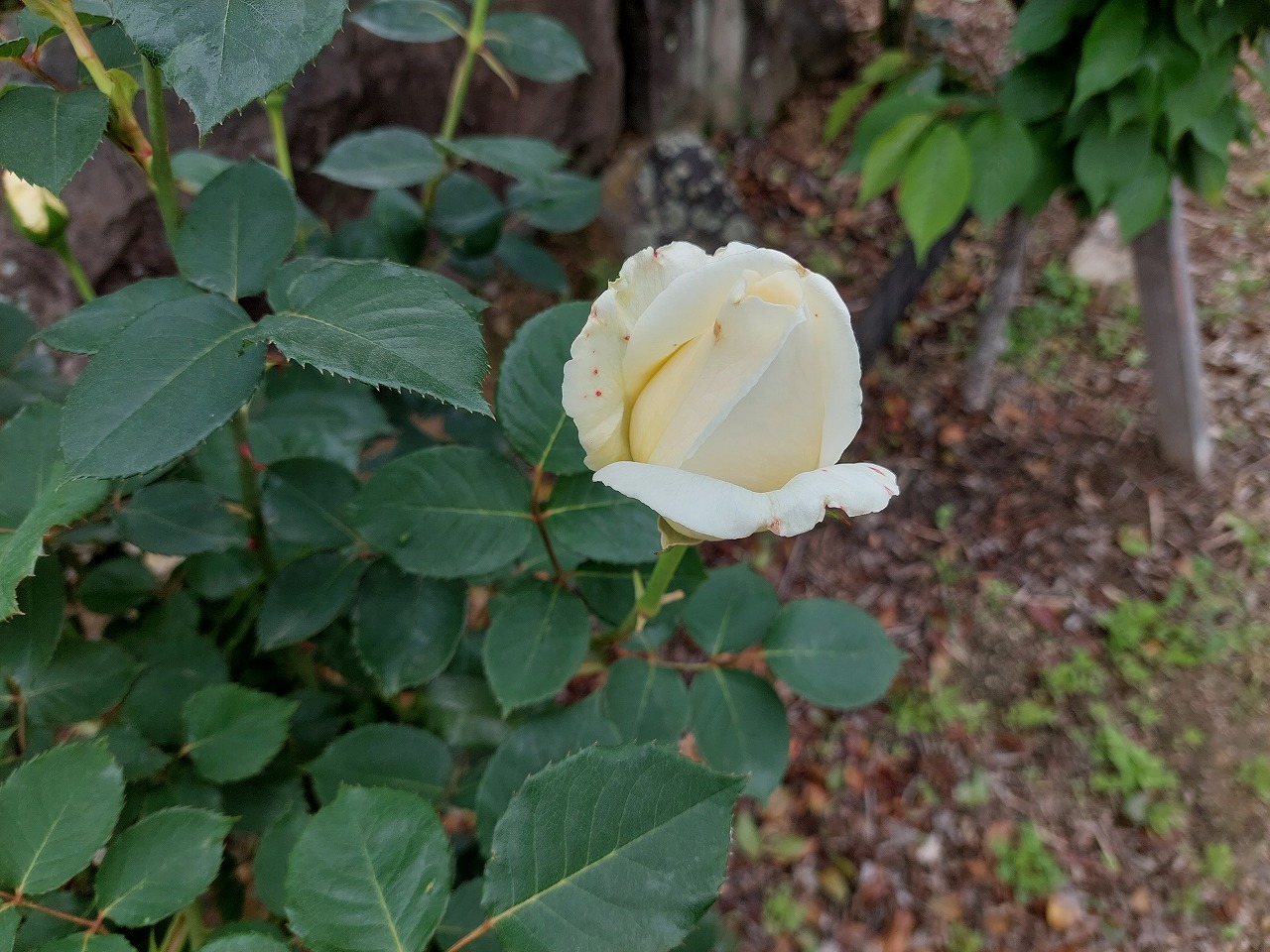 四季咲き大輪、アイボリーがかった白色の「ホワイトクリスマス」です。