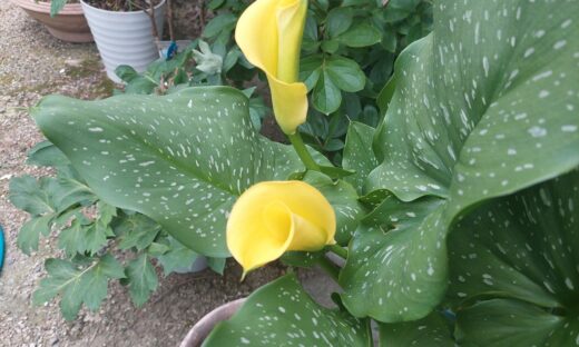 最近、カラーも集めはじめ、4鉢になりました。白にピンクの縁取りの可愛い花が咲いています。