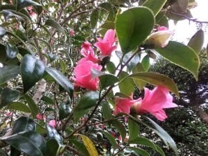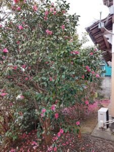 庭に植えている「べにわびすけ(紅侘助)」の花が見ごろを迎えました。