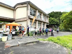 NPOの仲間と一緒に、旧山移小学校のエイドステーション(休憩所)で、緑茶とそば饅頭のおもてなしをしました。