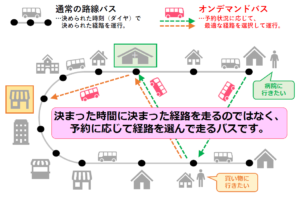 デマンド運行は、利用者からの事前の要望(予約)に応じて、どのルートで運行するか(どの停留所を経由するか)を決めるタイプです。(乗降車場所が決められている。)