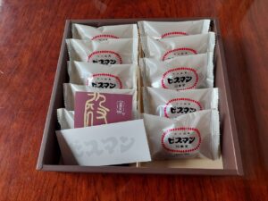 「ビスマン」は、殿畑双葉堂3代目の忠さん(故人)が、ビスケット生地に黄身あんを入れて焼き上げ、1955年に発売しました。市内外の土産店やネットショップなどで売られています。映画の帰りに、久しぶりに購入して食しました。