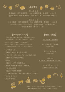 地元の食材を使用したあたたかいグルメやスイーツの販売、ピアノや歌の音楽演奏など楽しめるコンテンツが盛りだくさん!さらに、しめ縄づくりや丸太切り、トランポリンなど親子で参加できるワークショップも開催されます。