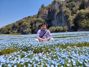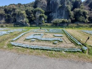 さて、アメリカの方を中津駅にお迎えに行き、途中で本耶馬渓町のネモフィラ畑に招待しました。