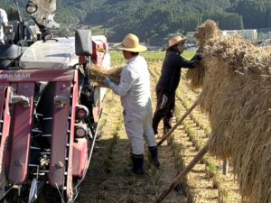 地域振興にっぽん酒をつくる会で「稲こぎ」2025.10.18 おはようございます。中津市議会議員の大塚正俊です。昨日、母校の北部小学校大運動会に行ってきました。小学2年生になった孫の成長に感激しました。午後から、耶馬溪にっぽん酒をつくる会の「稲こぎ」に参加しました。竿掛けした稲の穂をコンバインで脱穀していきます。約1時間の作業でしたが、玉のような汗をかきました。籾は乾燥・籾すりの後、三和酒類に持ち込んで、日本酒に醸造してもらいます。 Post Share RSS 地域振興小ねぎの4回目の収穫地元八社神社の秋祭りで豊前蛎瀬神楽を奉納