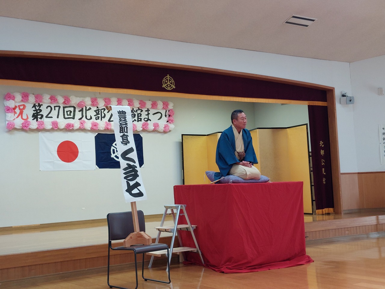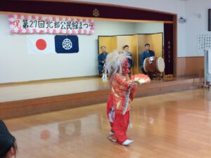 ステージでは、「蛎瀬子ども神楽」の奉納や「豊前亭くま七」さんの落語、城北中学校コーラス部の合唱、オカリナ、日本舞踊などが披露されました。
