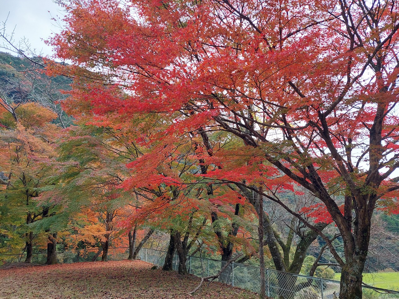 深耶馬や奥耶馬では、ちょうど紅葉の見ごろを迎え、三郷小中詰分校(写真)できれいなもみじが鑑賞できました。