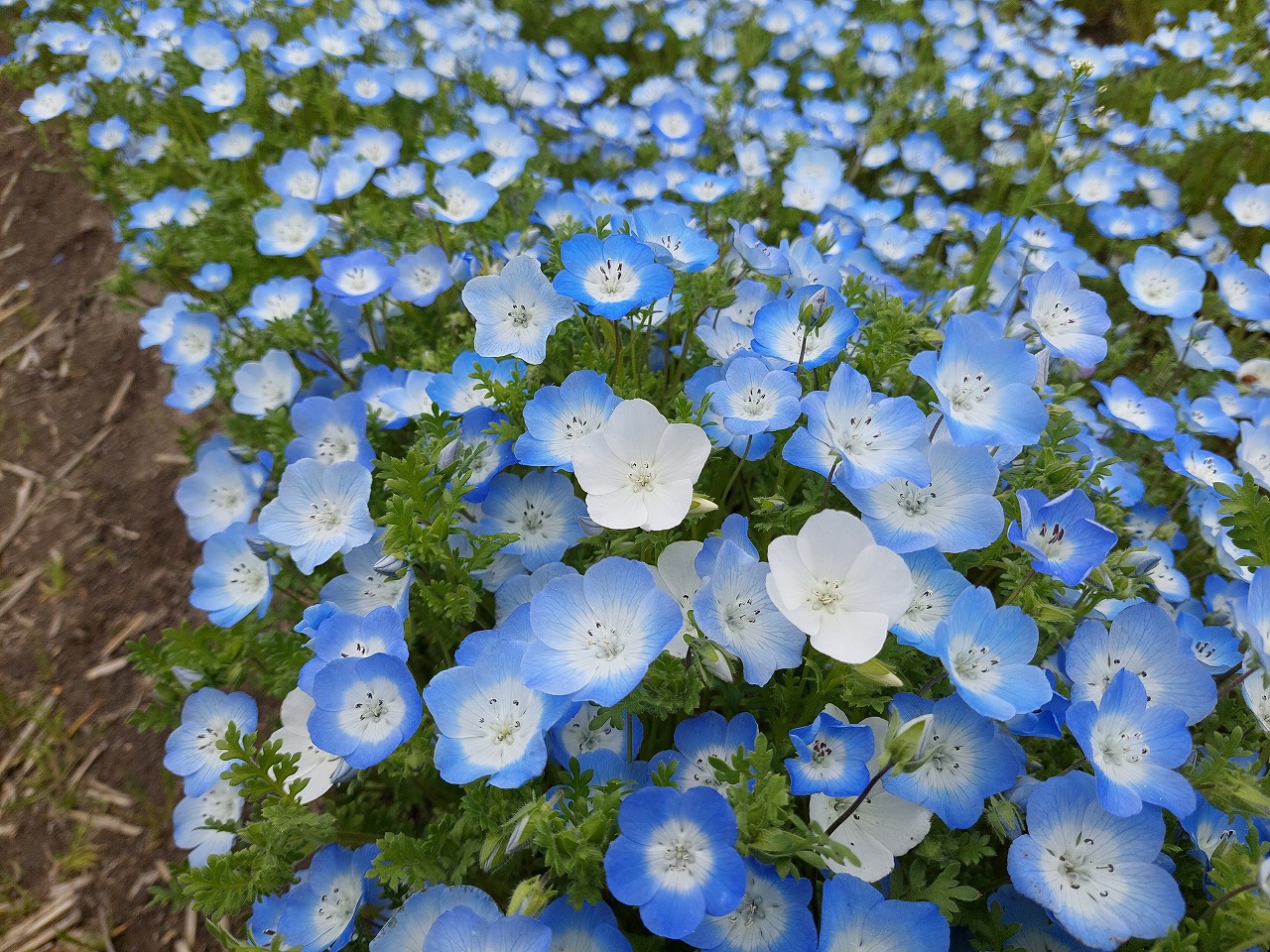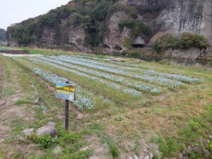 この畑は、「青の洞門を青に染めるプロジェクト」で毎年取り組まれているもので、爽やかなスカイブルーの花が見ごろを迎えています。