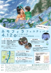 今日(4/12)11時から13時30分まで、旧レストハウス洞門駐車場(青の洞門対岸のネモフィラ畑横)にてネモフィラフェスティバルが開催されます。太鼓や神楽などの伝統芸能が披露され、イベントの最後には菓子・餅まきも行われます。