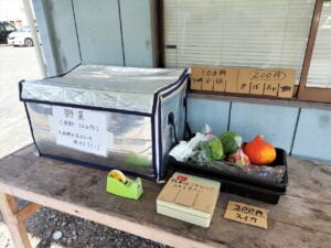 耶馬渓で採れた減農薬、有機栽培の野菜が並べられています。
