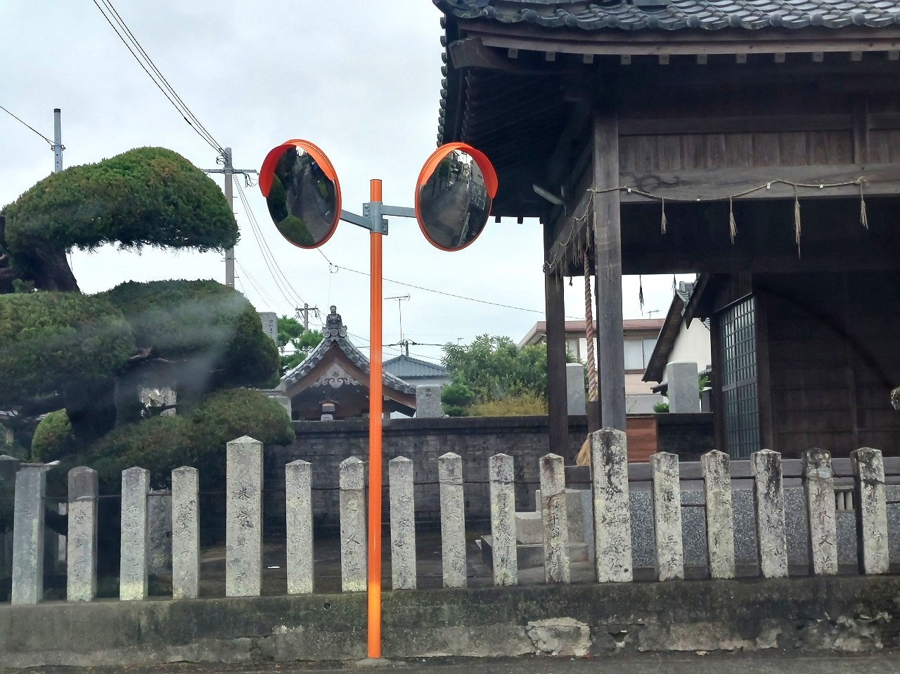 船場町日光神社前の変則交差点に2面のカーブミラーが設置されました。