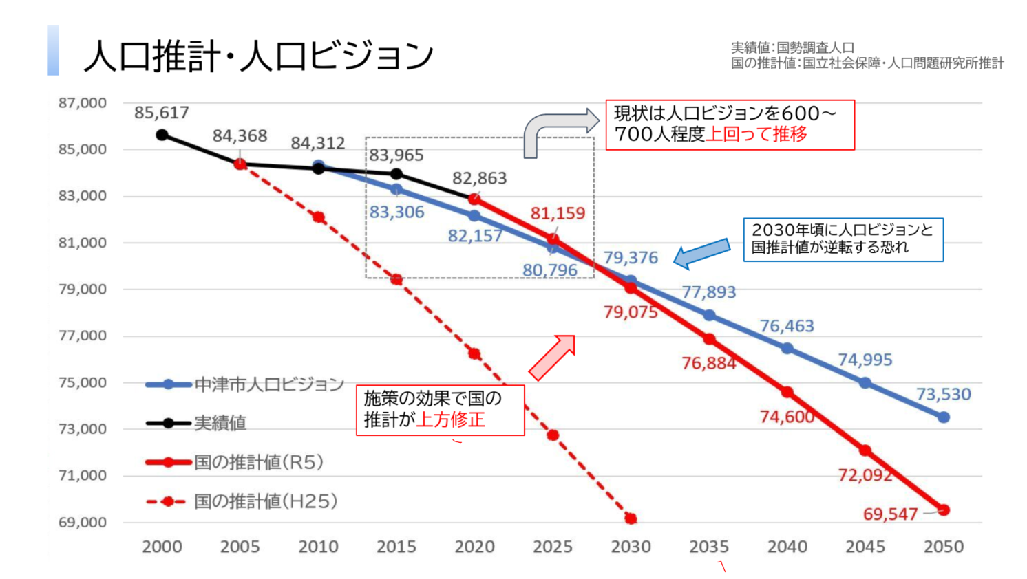 中津市の人口は、これまでの施策の成果によって、国の将来推計を上回る人口を維持してきているものの「2030年頃に人口ビジョンと国推計値が逆転する恐れ」にあることが示されました。