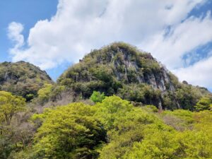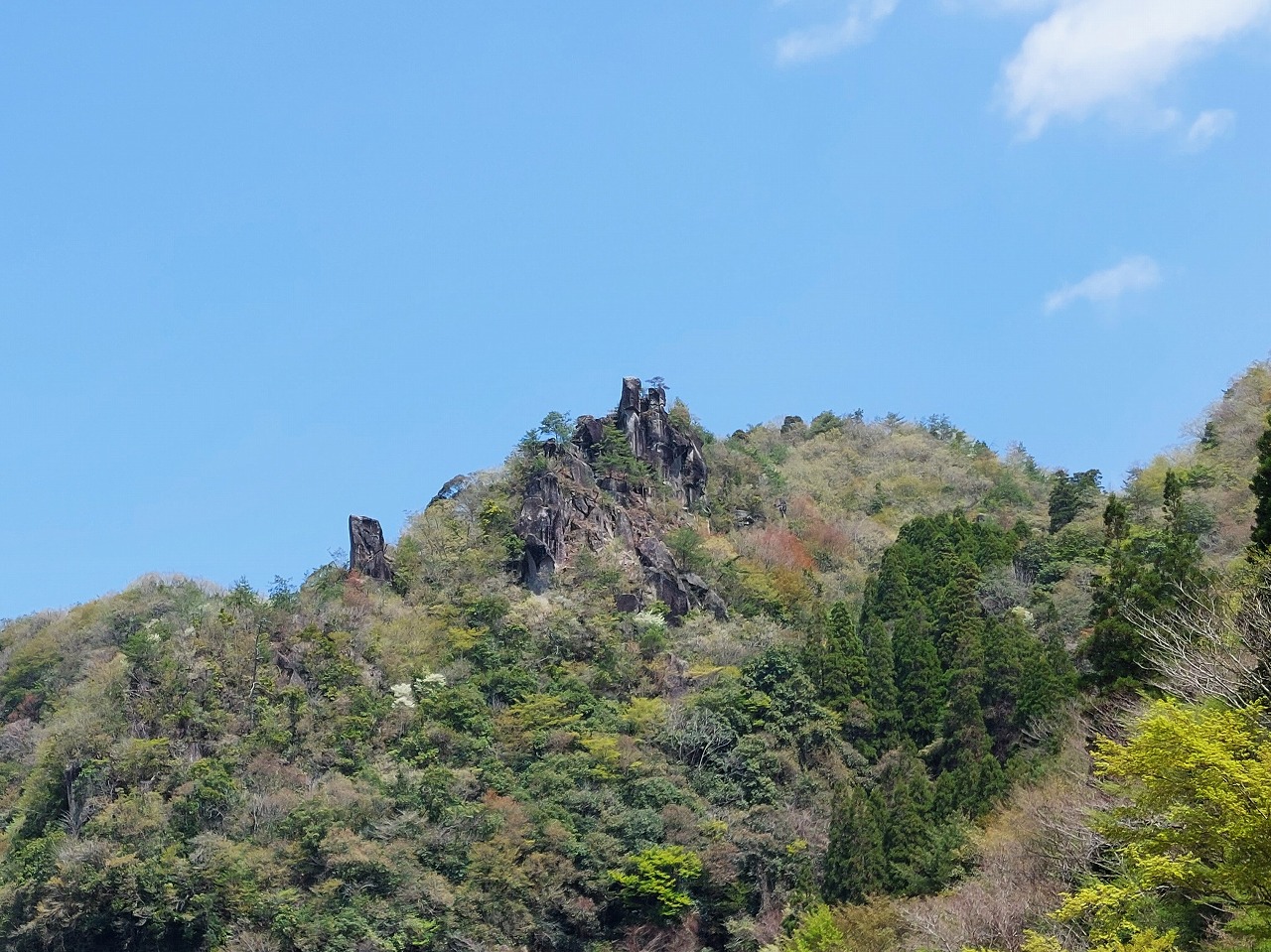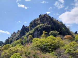 「一目八景」から見える群猿山、夫婦岩、鷲の巣山などの奇岩秀峰が新緑と青空に映えています。