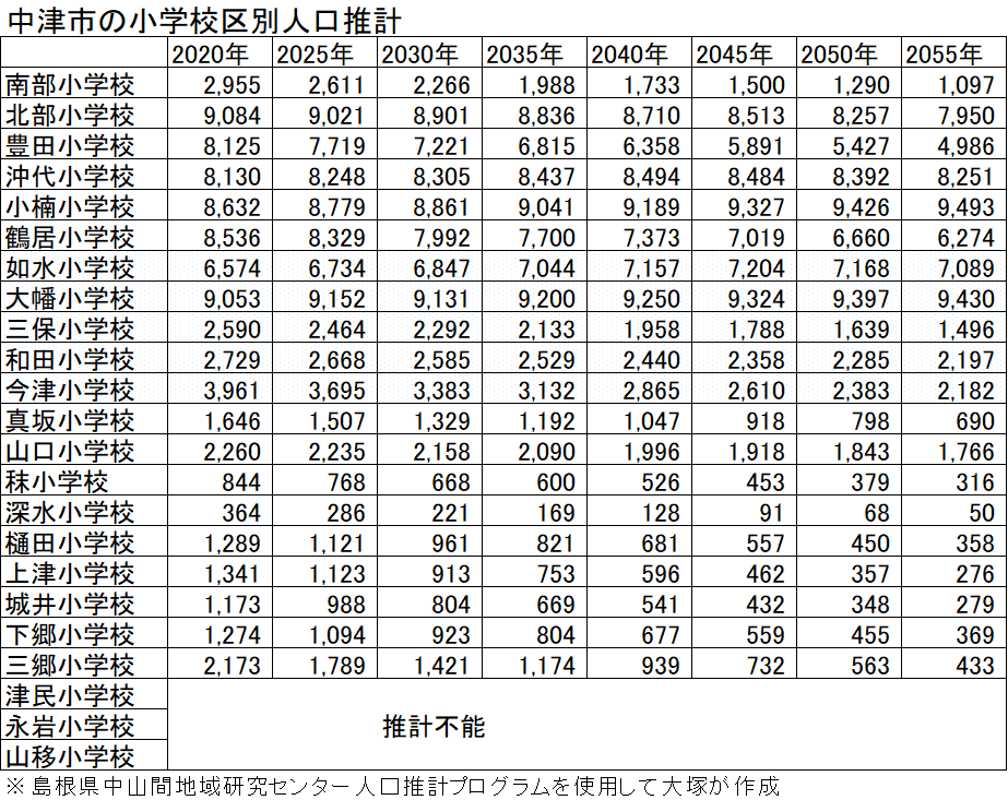 旧市町村別や小学校区別に人口推計をしていくと、中津市全体の人口推計だけでは視えない人口減少の実態が見えてきます。