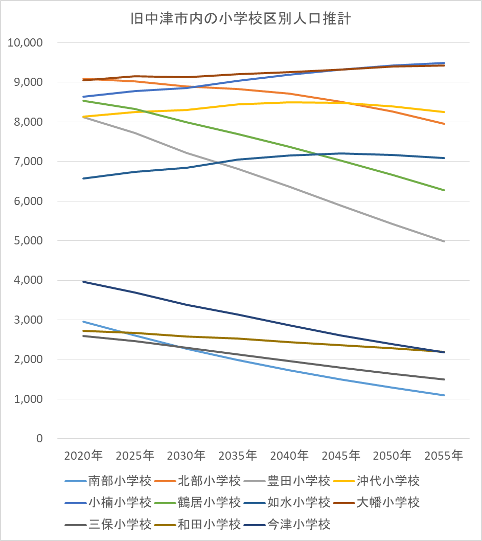 私の住んでいる北部小学校区は、9,021人から7,950人に減少します。2020年時点の推計では人口が増える校区でしたが、最近の宅地造成やアパート建築の鈍化により減少校区となっています。