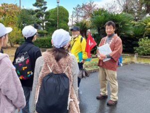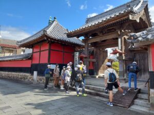 出発式の後、観光ボランティアの方と一緒に、豊田小~諸町のまちなみ~村上医家資料館~生田門~中津歴史博物館~中津城~福沢旧邸~豊後街道のまちなみ~寺町を巡りました。